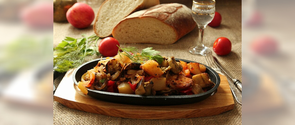 Мясо с овощами и сыром в керамической лодочке